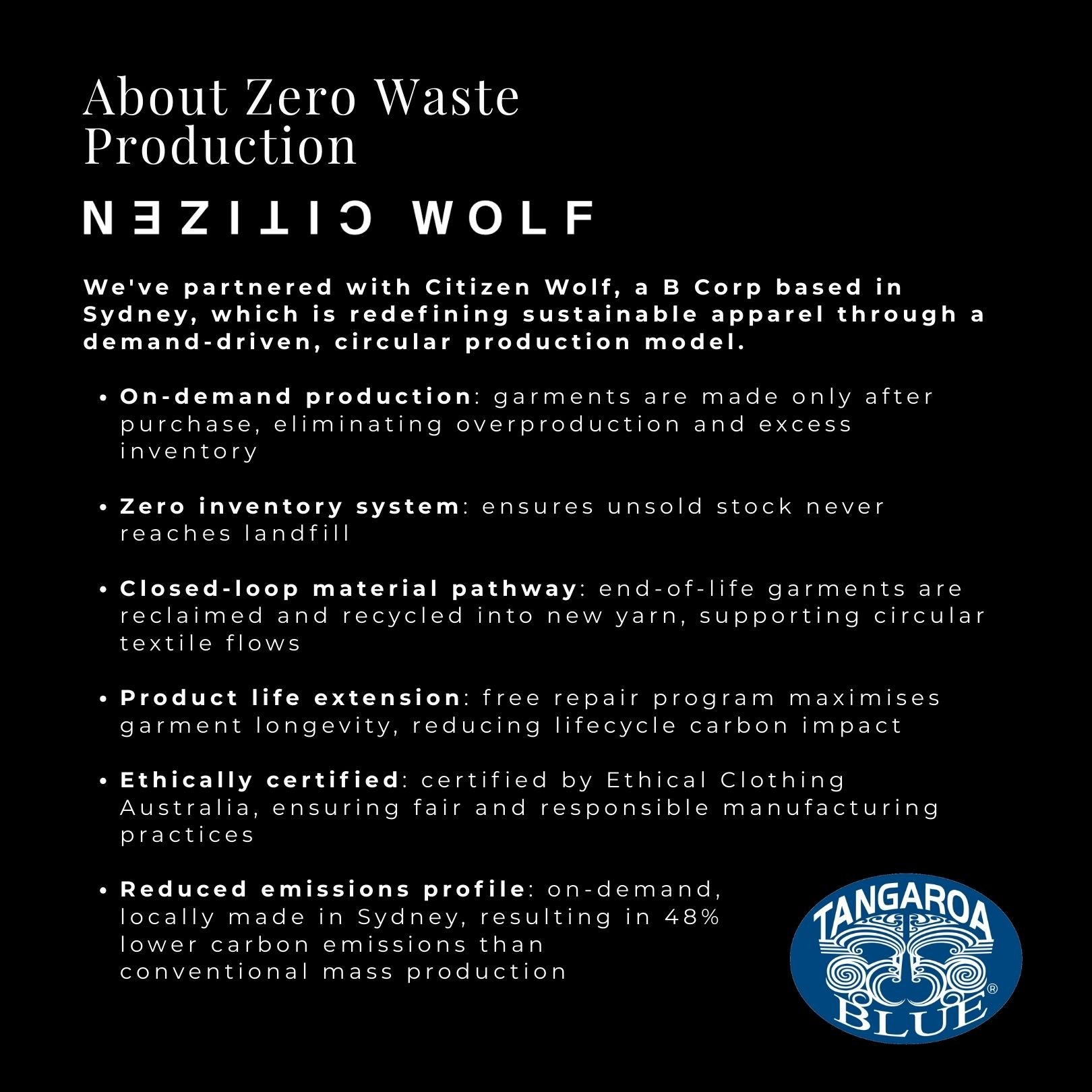 Produced in collaboration with Citizen Wolf, this t-shirt is made using a radically different approach to fashion. Each garment is created on demand—only after it’s ordered—eliminating overproduction and waste. Citizen Wolf’s clothing is zero waste, and when you’re finished with it, it can be returned and remade into new yarn, closing the loop on textile waste. Citizen Wolf also offers free repairs, helping extend the life of your tee for as long as possible.